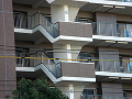 - バルコニーはレイディアントシティと同様の幅広の縦ルーバー型の柵ですね。視界が開け室外機の放熱性もよい反面、外からもスケスケなので チープ感が否めないのでしょうね。共用廊下側も同様の幅広縦ルーバーの柵でしたが、それが階段にも続いています。こちらもレイ ディアントシティと同様です。同じ時期の長谷工物件ということでコンセプトは違えど仕様的には似てくるのでしょうか。個人的にはそこはせ めてコンクリート+塗装であってほしいと思うのですが…。踊場正面のみタイル張りでした。