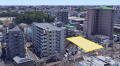 - 現地は改札出なくてもホームの端っこからでも見れますよ!建設予定地の前に同じ12階のピンクのマンションが建っているので、日中は日当たりも確認できます。最近工事が進み、マンションの外枠?みたいのが出来てますが、かなり目の前のマンションと近いです。
